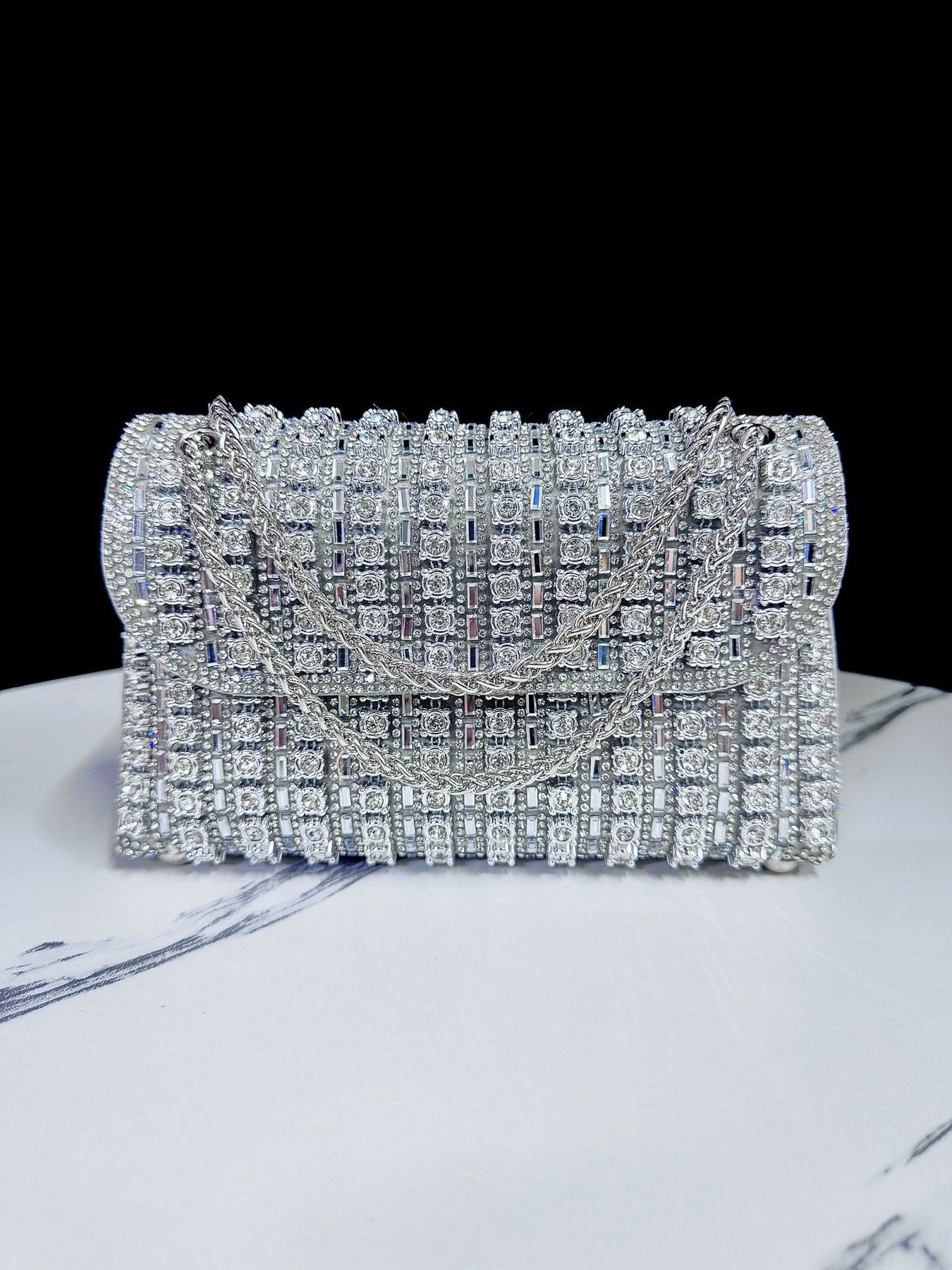 This stunning bag features glittering diamond inlays that reflect light beautifully, paired with a refined chain strap that adds a touch of glamour and versatility. Wear it as a chic handheld clutch or as a stylish crossbody for effortless elegance throughout the night.